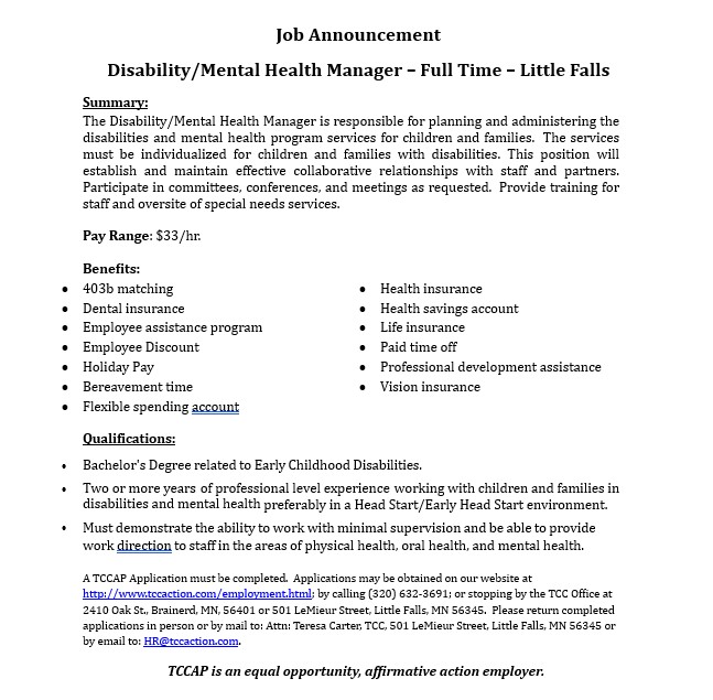 TCCAP serves a diverse range of clients from all cultures and ethnicities. Applicants must be comfortable working closely with and serving a diverse group of colleagues and clients. Applicants also need to be comfortable working with families for whom English might be a secondary language.
