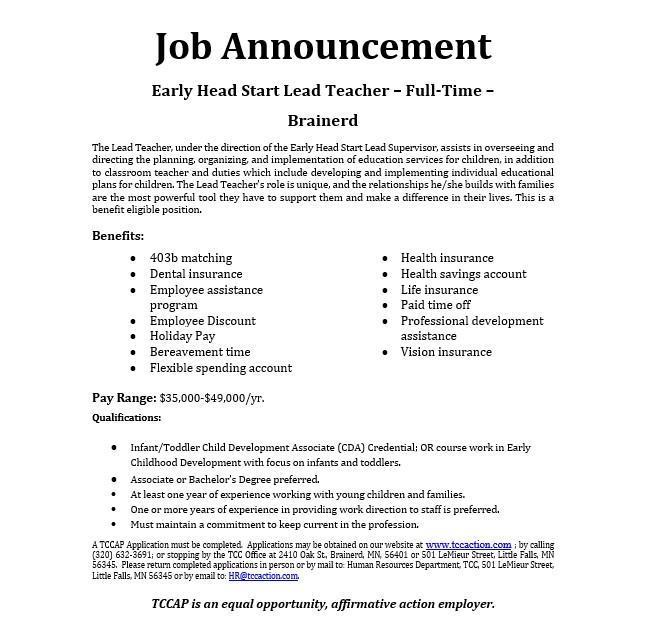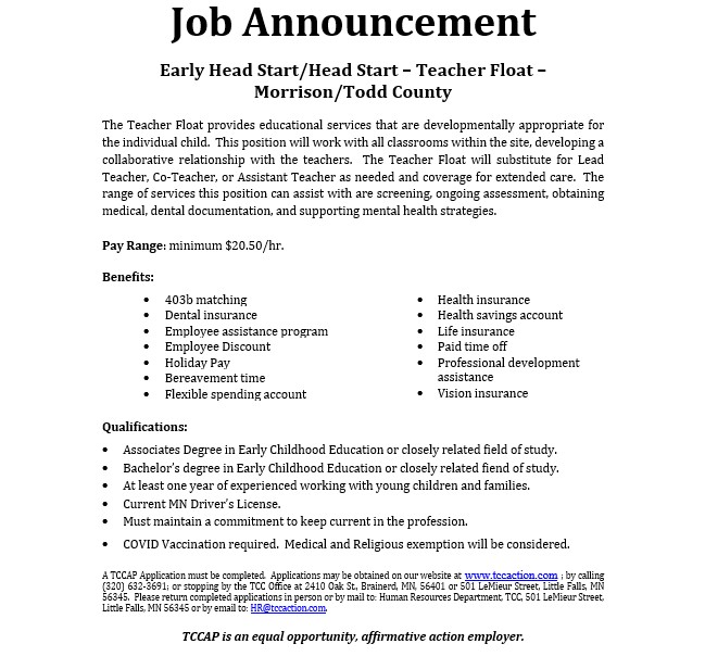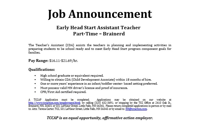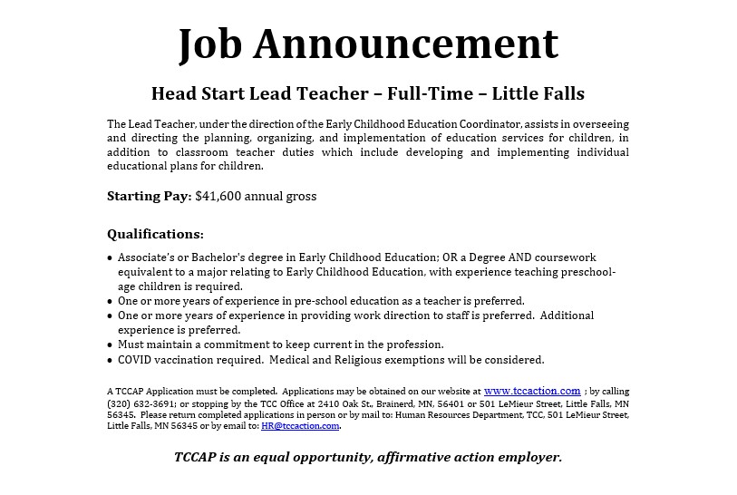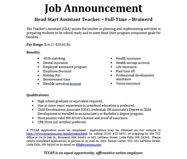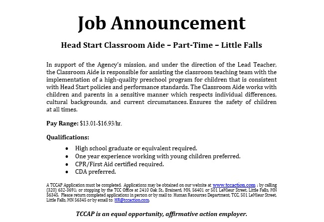 Tri-County Community Action Partnership (TCCAP) is a nonprofit community action agency serving low-income residents of Crow Wing, Morrison, and Todd counties. TCCAP operates Head Start: Prenatal to Five early childhood education programs and many other essential, safety net programs to aid and support impoverished local families..